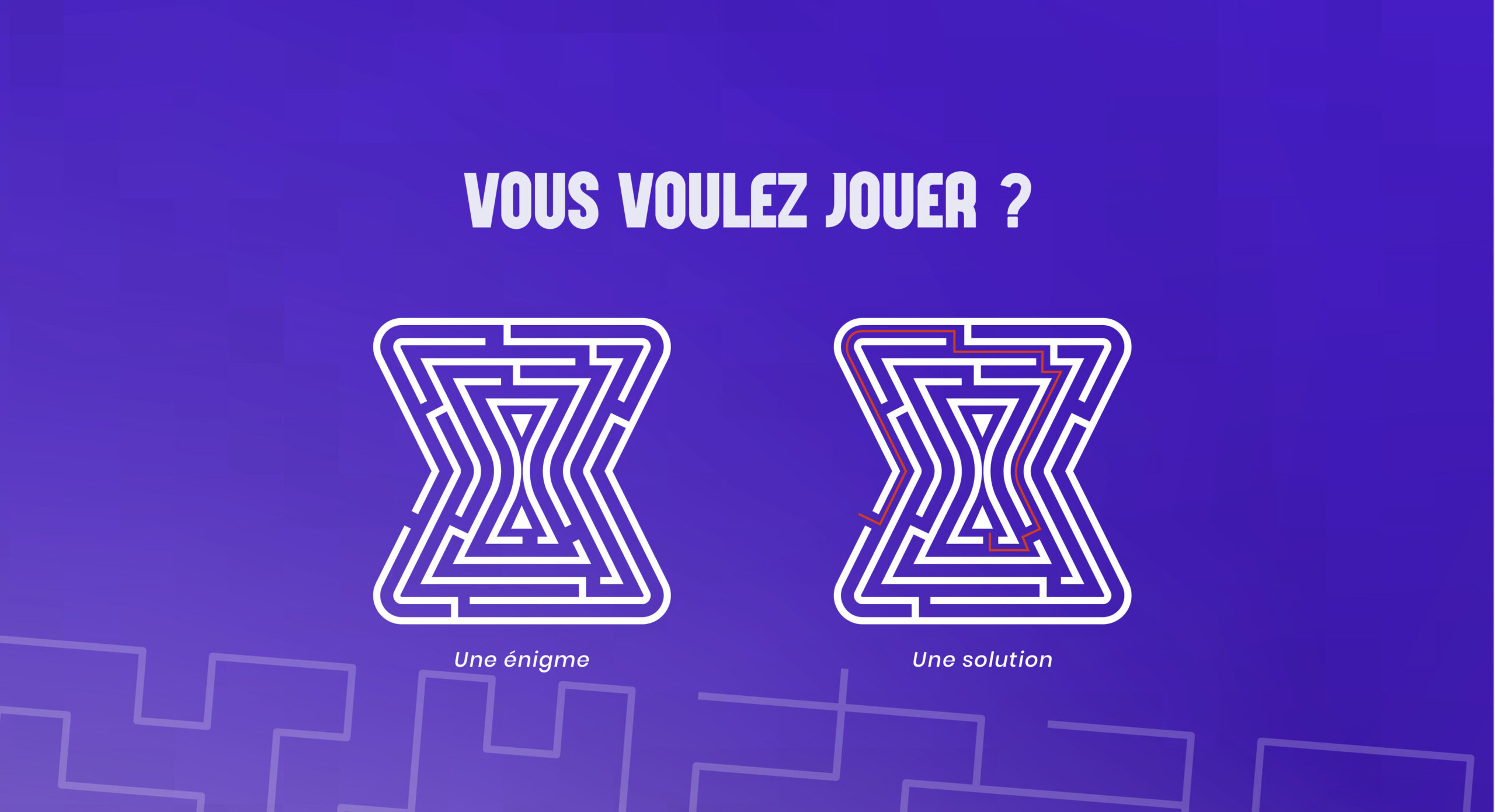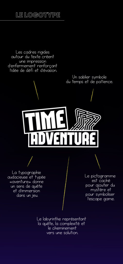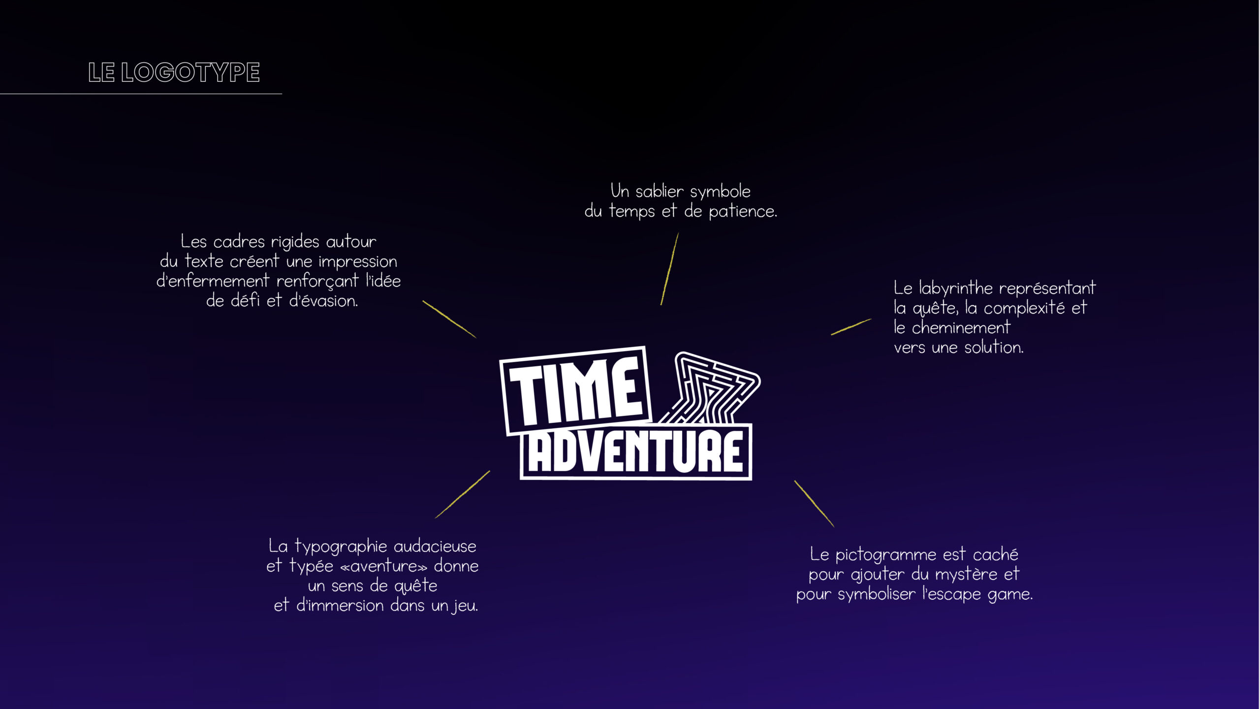 Attente, enfermement, temps, pression, immersion… Ces mots-clés ont guidé la création du logo. Le labyrinthe en est le cœur : symbole du cheminement, des énigmes et des impasses. Le sablier, lui, rappelle le temps qui s’écoule et le défi d’une heure pour s’évader. Enfin, les formes fermées traduisent cette sensation d’enfermement propre à l’expérience, entre tension et excitation.